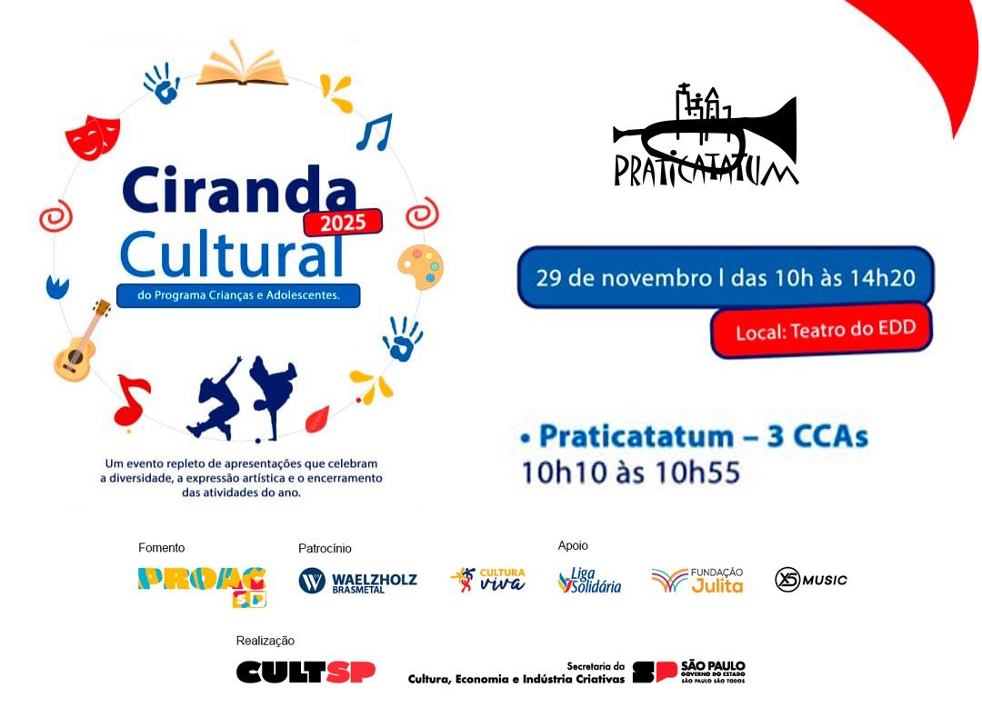 Praticatatum na Ciranda Cultural no por pratica_2 Blog, Eventos 28/11/2025 É AMANHÃ! O Praticatatum estará presente na Ciranda Cultural, no Teatro EDD, nesta sábado, 29 de novembro, às 10h10. Compartilhar: